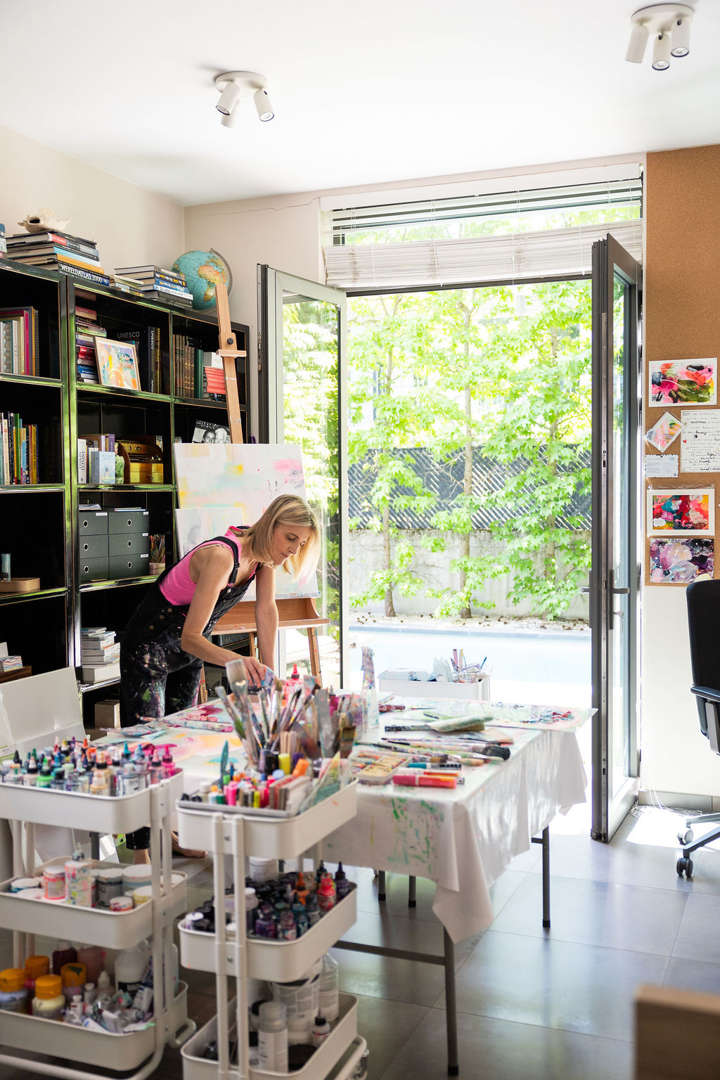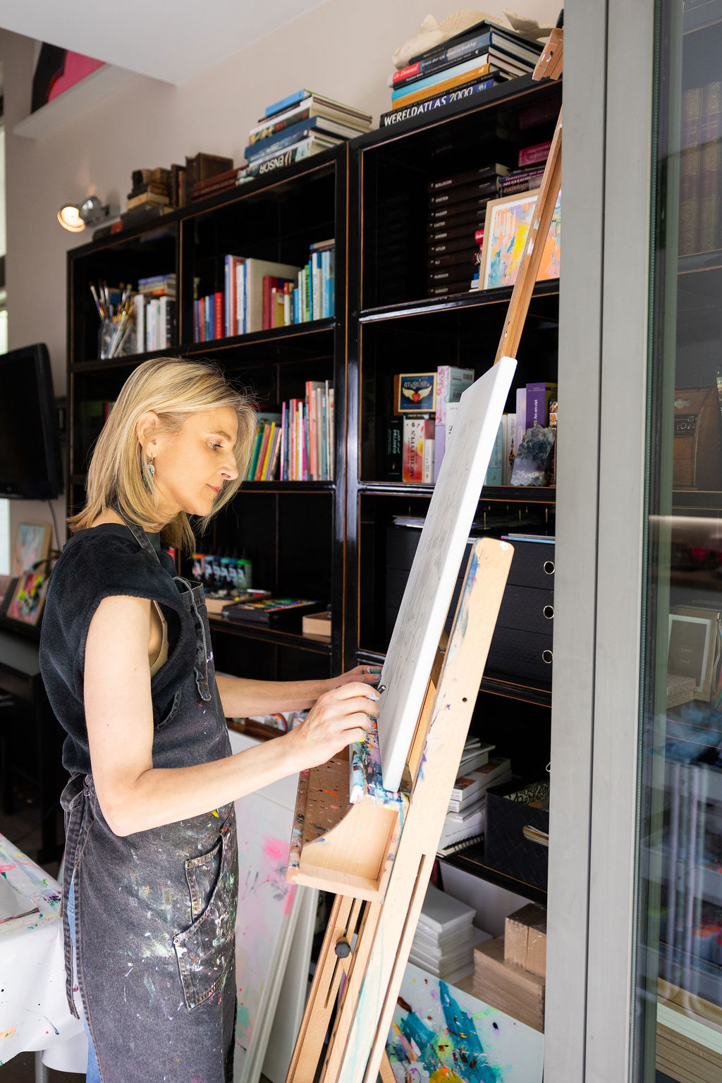 In mijn open en gastvrije atelier schilderen we samen. Ik ga zelf ook aan de slag, dus we delen niet alleen de ruimte, maar ook het proces en de inspiratie.